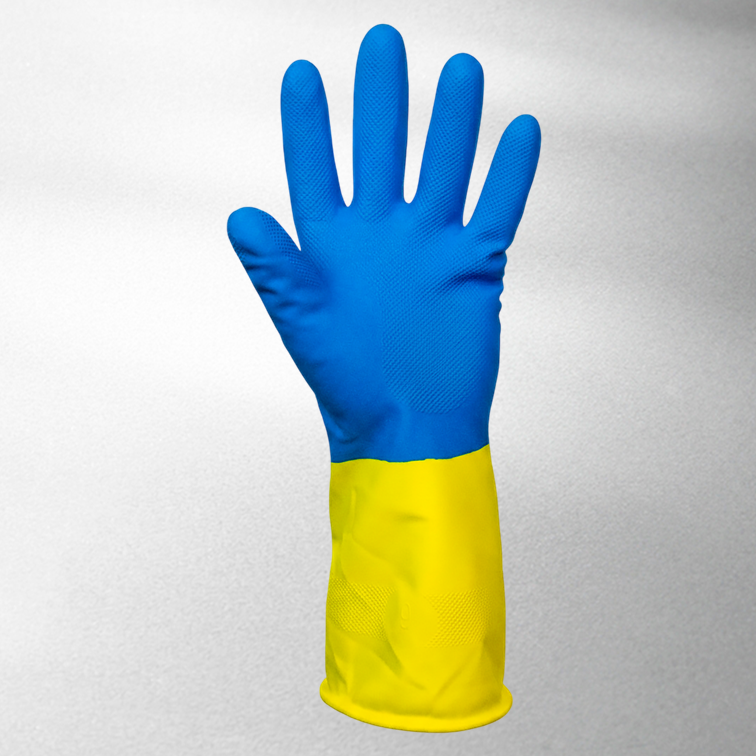 Proteção das mãos contra agentes abrasivos, cortantes e escoriantes, contra agentes químicos, contra agentes biológicos e contra umidade proveniente de operações com uso de água. Luva confeccionada em borracha natural (látex) e neoprene, revestida internamente em flocos de algodão, acabamento antiderrapante na palma.