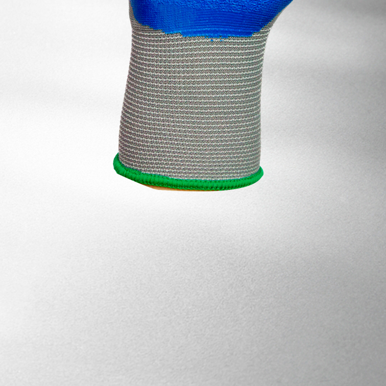 Luva de segurança tricotada em fibras sintéticas, revestimento em borracha natural antiderrapante na palma, face palmar dos dedos e ponta dos dedos, punho tricotado nas mesmas fibras, acabamento em overloque.