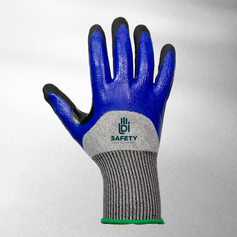 Luva confeccionada em fibras sintéticas resistente ao corte hppe, banho nitrílico duplo na palma, face palmar dos dedos e 3/4 do dorso, reforço entre o polegar e o indicador, acabamento sandy na palma para maior aderência.