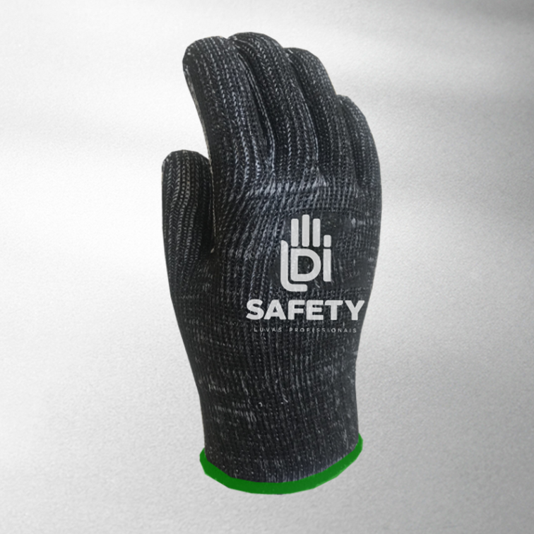Luva de segurança tricotada em algodão preto com pigmento de PVC na palma, punho tricotado, acabamento em overloque.