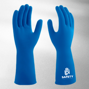 Luva de segurança confeccionada em fibras sintéticas, revestimento em borracha nitrílica na palma, dedos e dorso.